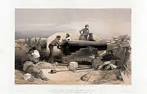 "A Quiet Day in the Diamond Battery", 15 December 1854, by William Simpson. Depicts naval guns deployed ashore in the Crimean War.