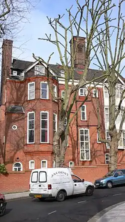 It is a large red brick detached house between Frognal and Hampstead in London.