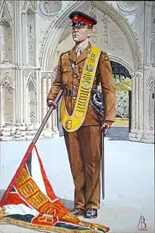 6 Royal Anglian Officer with the Bn colours at the Abbey Gate from a painting by & with the permission of Alix Baker, 1996. - Headquarters (Suffolk) Company, in Bury St Edmunds