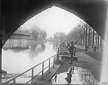 The advance continued, and by 20 October 30th Division was advancing on a broad front with 21st Bde back in the line. The brigade ran into resistance on the Ruddervoorde Spur, and though it pushed in the outposts there was a strongly-wired position behind on the St Genois Spur (part of the Courtrai Switch trench line). The ground between the spurs was swept by German artillery fire and 21st Bde was halted, which stopped the whole divisional advance. However, 21st Bde gained some ground by making a charge after dark. Next day 30th Division was ordered to clear the enemy from the west bank of the River Scheldt, and 21st Bde reached the top of the St Genois Spur by 11.00. After halting along the railway line, the brigade then pushed on to its objective along the Helchin–Bossuyt road parallel with and close to the Scheldt.. However, without artillery it was unable to take Bossuyt with its outlying chateau and park.[52]