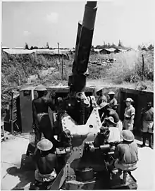 The TA's AA units were mobilised on 23 September 1938 during the Munich Crisis, with units manning their emergency positions within 24 hours, even though many did not yet have their full complement of men or equipment. The emergency lasted three weeks, and they were stood down on 13 October.[45] In February 1939 the existing AA defences came under the control of a new Anti-Aircraft Command. In June a partial mobilisation of TA units was begun in a process known as 'couverture', whereby each AA unit did a month's tour of duty in rotation to man selected AA and searchlight positions. On 24 August, ahead of the declaration of war, AA Command was fully mobilised at its war stations.[46]