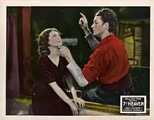 7th Heaven (also known as Seventh Heaven) is a 1927 American synchronized sound romantic drama directed by Frank Borzage, and starring Janet Gaynor and Charles Farrell. While the film has no audible dialog, it was released with a synchronized musical score with sound effects using the Movietone sound system. The film is based upon the 1922 play Seventh Heaven, by Austin Strong and was adapted for the screen by Benjamin Glazer.[3] 7th Heaven was initially released as a standard silent film in May 1927. On September 10, 1927, Fox Film Corporation re-released the film with a synchronized Movietone soundtrack with a musical score and sound effects.