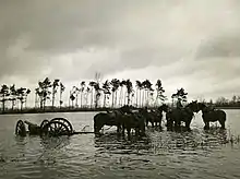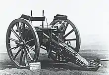 The iron carriage had a steel axle, and wooden wheels with iron tires. There were two brackets of sheet iron which converged to the point where the gun was towed. The gun was fixed with its trunnions fitting into two semi-circular openings in the brackets. These were then locked shut with a semi-circular iron clasp. Between the brackets there was a small trail-box. The elevation screw came up from the carriage to a point below the breech of the gun. The screw was operated by a hand-wheel situated on the outer face of the right bracket.[33] The gun carriage did not allow for sideways movement of the barrel. Taking aim was done by shifting the rear of the carriage. To gain leverage, one of the poles sticking upwards on the side of the barrel (see e.g. the photo of the gun in the Waadtländisches Militärmuseum Morges) was placed in an opening at the end of the carriage.