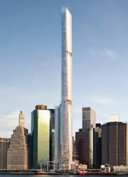 A new design of the building without the spire, decreasing the tower to 826 feet (252 m), was planned to be finished in 2016. China Oceanwide Holdings Limited acquired 80 South Street in March 2016, with plans to create a 113-story tower.[7] Demolition permits for 80 South Street and 163 Front Street were filed during early 2017.[8] By 2018, work had stalled due to China Oceanwide's financial difficulties.[9] The site was then listed for sale in early 2019;[10] that June, China Oceanwide received a $175 million loan for the site.[11]