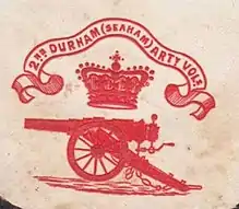 The enthusiasm for the Volunteer movement following an invasion scare in 1859 saw the creation of many Rifle, Artillery and Engineer Volunteer units composed of part-time soldiers eager to supplement the Regular British Army in time of need.[1][2] One such unit was the Seaham Artillery Volunteers formed at Seaham in County Durham on 14 March 1860, which became the 2nd (Seaham) Durham Artillery Volunteer Corps' (AVC).[3][4][5] From 1863 the 1st, 3rd (South Shields) and 4th (Hartlepool) Durham AVCs were attached to it; the 1st and 3rd were attached to other units in 1873 and the 4th became independent in 1886.[3][5][6]