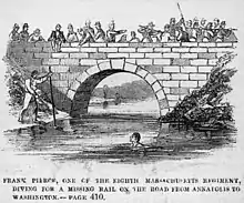 The 8th Regiment Massachusetts Volunteer Militia was a peacetime regiment of infantry that was activated for federal service in the Union Army for three separate tours during the American Civil War. The regiment consisted almost entirely of companies from Essex County, Massachusetts.[1] The Cushing Guards, established 1775, were Company A based in Newburyport. The Lafayette Guards, created 1825, were Company B from Marblehead. Company C, the Sutton Light Infantry, organized in 1805 as the Marblehead Light Infantry, was also from Marblehead. The Lynn Light Infantry, chartered in 1852 was Company D. Company E was the Beverly Light Infantry, organized in 1814. The second Lynn company was Company F, the City Guards, organized in 1814. The Gloucester unit in the regiment was Company G, the American Guards, first organized in 1788. The third and last Marblehead company was H, the Glover Light Guards, created in 1852 and named in honor of John Glover of the Revolution. The Salem Light Infantry, Company J, had been created in 1805 and in 1859 had taken up Zouave drill and were thence known as the Salem Zouaves. The lone non-Essex company was Company K, the Allen Guards, created in 1806, that came to the regiment from Berkshire County's reorganized old Tenth Militia regiment, and based in Pittsfield.[2]