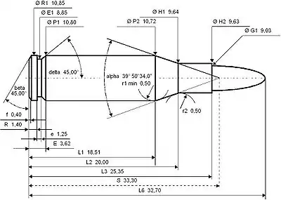 Americans would define the shoulder angle at alpha/2 ≈ 19.9 degrees. The common rifling twist rate for this cartridge is 250 mm (1 in 9.84 in), 6 grooves, Ø lands = 8.82 mm, Ø grooves = 9.02 mm, land width = 2.49 mm and the primer type is large pistol.