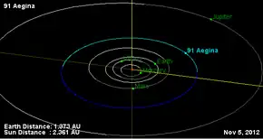 This body is orbiting the Sun with a period of 4.17 years and an eccentricity of 0.105. The orbit of this object brings it to within 4.9 Gm of the dwarf planet Ceres, and the resulting gravitational interaction has been used to produce mass estimates of the latter.[5] The cross-section size of the asteroid is 110 km and it has a rotation period of six hours. The surface coloring of 91 Aegina is very dark and this C-type asteroid has probably a primitive carbonaceous composition. Observation of absorption bands at wavelengths of 0.7 and 3μm indicate the presence of hydrated minerals and/or ice grains on the surface.[6]