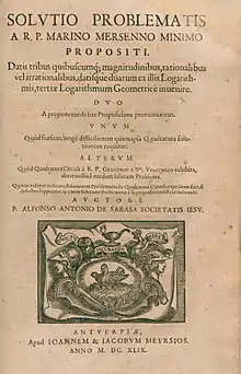 In 1649 Alphonse de Sarasa published Solutio problematis a R.P. Marino Mersenne Minimo propositi.[3] This book was in response to Marin Mersenne's pamphlet "Reflexiones Physico-mathematicae" which reviewed Saint-Vincent's Opus Geometricum and posed this challenge: