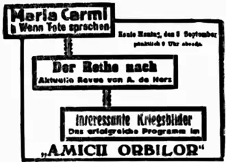 During that summer, several other of Herz's revues were produced at Ambasadori, including: Fata cu trei case din dafin ("Three-housed Girl of the Laurel Tree"), Țațo nu te supăra ("Frump Be Not Mad"), and Bac (from "Baccarat").[83] According to his wife, he wrote a new revue each night, including De-aia n'are ursul coadă ("That's Why Bears Don't Have Their Tails").[2] Scena reported on the Germanized theatrical milieu of Bucharest. Its film chronicles praised German propaganda films, including one produced in Bucharest, with live footage of Marshal Mackensen, and gave ample coverage to German or Austrian film stars, including Leda Gys, Mia May, Hella Moja and Alwin Neuß.[102] Scena also reported on tours by Theater an der Wien and Darmstadt Court Opera, as well as German plays staged by Romanian managers such as Velimir Maximilian and Marioara Voiculescu.[103] Nevertheless, Herz and Maximilian had a running dispute, which peaked in October, when Maximilian slapped Herz in public, on Calea Victoriei.[104] Around that time, the brochure Caricatura sub ocupație ("Caricature during the Occupation"), attributed by Călinescu to Herz himself[3] and by others to Maniu,[105] presented the work of a staff cartoonist by the name of Philips, who had "tried to replace our famous draftsmen".[106]