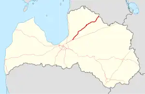 The A3 is a national road in Latvia connecting Inčukalns to Estonian border in Valka. The road is part of European route E264, and part of TEN-T road network of Latvia. After the border, the road turns into Estonian National Highway 3, which leads to Jõhvi in northeastern Estonia. The length of A3 in Latvian territory is 122 kilometers. The road leads through the scenic Gauja National Park. Currently A3 has 1x2 lanes in full length. A3 bypasses Valmiera, which is one of the biggest cities in Latvia. There aren't any plans to widen it in near future. Almost half of A3 was reconstructed in 2012. Speed limit is 90 km/h. The average AADT on A3 in 2015 was 5317 cars per day.