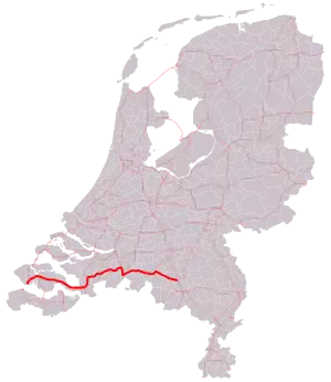 The speed limit on the eastern half is 120 km/h (75 mph), whereas the shared section with the A16, and in Zeeland, the speed limit is 130 km/h (80 mph).