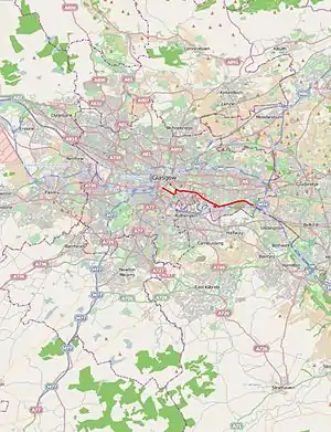 Beyond Hamilton, it followed the Glasgow Road north-west, crossing the Clyde at the Dalmarnock Bridge. It ended at the junction of Trongate and Gallowgate in the east end of Glasgow city centre.[3] According to a summary in a report by the Institution of Civil Engineers, the length was 150 kilometres (93 mi).[4]