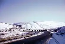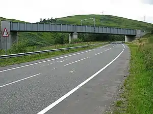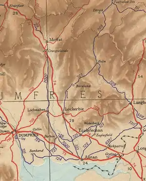 After passing through Gretna and Gretna Green, it followed the general line of the Caledonian railway toward Lockerbie and crossed the River Annan over a 24.4-metre (26.7 yd) bridge at Johnstonebridge. It followed the Annan valley into a rural area away from any settlements as it crossed the Beattock Summit between the Annan and Clyde valleys towards Elvanfoot. This section is on a different alignment from the Roman Road, which, as might be expected, took a straighter route across more mountainous terrain, particularly at the Roman signal station near Black Fell.[4][5]