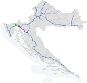 The A7 motorway is an important north–south motorway in western Croatia, connecting the nation's largest port and the city of Rijeka to the Slovenian road network at the Rupa border crossing.[7][8] The A7 motorway currently connects to the rest of the Croatian motorway network via the A6 motorway in Orehovica interchange.[9] The motorway is a part of International E-road network routes E65 and E61. The sections south of Orehovica interchange are a part of the E65, while the remaining sections are a part of the E61.[10]