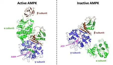 5' AMP-activated protein kinase or AMPK or 5' adenosine monophosphate-activated protein kinase is an enzyme (EC 2.7.11.31) that plays a role in cellular energy homeostasis, largely to activate glucose and fatty acid uptake and oxidation when cellular energy is low. It belongs to a highly conserved eukaryotic protein family and its orthologues are SNF1 in yeast, and SnRK1 in plants. It consists of three proteins (subunits) that together make a functional enzyme, conserved from yeast to humans. It is expressed in a number of tissues, including the liver, brain, and skeletal muscle. In response to binding AMP and ADP,[1] the net effect of AMPK activation is stimulation of hepatic fatty acid oxidation, ketogenesis, stimulation of skeletal muscle fatty acid oxidation and glucose uptake, inhibition of cholesterol synthesis, lipogenesis, and triglyceride synthesis, inhibition of adipocyte lipogenesis, inhibition of adipocyte lipolysis, and modulation of insulin secretion by pancreatic β-cells.[2]