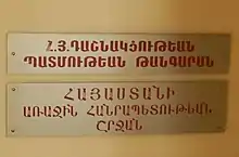 The museum displays government documents, stamps and other artifacts. The first of its exhibits is dedicated to the Democratic Republic of Armenia of 1918 to 1920. It displays official documents presented by Armenia at the Treaty of Versailles in 1919 as well as personal effects from the first republic's prime ministers; Hamo Ohanjanyan, Alexander Khatisyan, Simon Vratsian and Hovhannes Katchaznouni. Personal effects from generals Andranik Ozanyan and Drastamat Kanayan are among the highlights of the exhibit as well.[1]