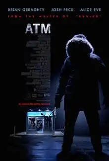 ATM is a 2012 American horror thriller film directed by David Brooks and starring Brian Geraghty, Alice Eve, and Josh Peck. The film centers on three people trapped in an ATM booth by a psychopathic hooded figure.