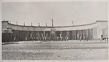 The First Las Vegas roundhouse would begin construction in August 1879, and finish just one year after the A.T.& S.F. connected to the Las Vegas Terminal. The building, which had a low-style roundhouse design would begin its life with accommodations for at least seven engines in total for storage and general maintenance. In September 1881 just one year after its installation, four additional stalls were added to the roundhouse for carpentry and rolling stock repair. A new 54' turntable was installed. An additional wing on the roundhouse was built large enough to contain nine more engines and between 1897 and 1899, a 60-foot turntable was installed. The roundhouse would ultimately end its days at twenty stalls in total.