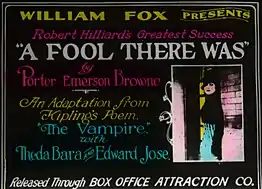 The film is based on the 1909 Broadway production A Fool There Was by Porter Emerson Browne, who in turn based his play on Rudyard Kipling's poem The Vampire.[1] Katharine Kaelred played the role of seductress, billed as "The Woman".[7] The star of the play was Victorian matinee idol Robert C. Hilliard.[7] Hilliard's name featured prominently in some advertisements for the movie, though he had no connection with the film.[8]