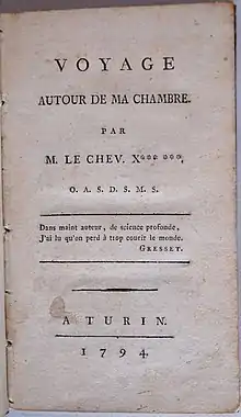 A Journey Around My Room (originally published in French as Voyage autour de ma chambre) is a 1794 book by Xavier de Maistre. It was written to stave off boredom whilst the author was serving a 42-day sentence of confinement to his room for participating in an illegal duel. The book is written in the style of a travelogue and discusses the contents and furniture of his room as well as imaginary situations and dialogues. The theme of the work is that pleasure can be found in one's everyday surroundings. At the end of the work he notes his regret at having to return to society. The work is thought to have been first published in English in 1871. A sequel, A Nocturnal Expedition Around My Room, was published in 1825.