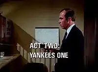 We then see Frank park his car in front of the credit union, avoiding an absurdly long stretcher removing a body of one of the victims as he enters. He inquires of his boss, Ed Hocken, about the case. Ed tells Frank that the alleged robber, Ralph Twice, is a good family man with no prior record. They both question Sally, who makes a really complicated statement (in the manner of Abbott and Costello's "Who's on First?" routine) in which she makes clear that Twice shot Jim Johnson twice, and then she shot Twice once. As Frank and Ed depart, Sally continues sobbing falsely, believing that they have bought her story.