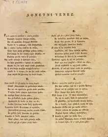 A Wreath of Sonnets (Slovene: Sonetni venec),[1] sometimes also translated as A Garland of Sonnets, is a crown of sonnets that was written by France Prešeren in 1833.[2][3] It was published for the first time in the German-language Ljubljana newspaper Illyrisches Blatt (Illyrian Newspaper) on 22 February 1834. It consists of 15 sonnets and is enriched with acrostic in the concluding sonnet. In the crown, Prešeren tied together the motives of his own unhappy love towards Julija Primic with that of an unhappy, subjugated homeland.