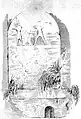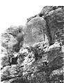 The shape of [Aadloun's rock-cut] tombs is not the only stamp of antiquity that distinguishes this necropolis from other burial places found in Syria. We also see one of these Egyptian steles, quite similar to those we have drawn on the banks of Nahar-el-Kelb, not far from Beirut. The Adloun stele depicted a conqueror making an offering of prisoners to the god Phtha. This is all that can be recognized, even with the help of the shadows projected by the light of a torch. The corrosive action of the sea air has erased the hieroglyphic legend that covered this stele from the height of the god's shoulders to the bottom of the frame, and only a few isolated signs are visible.