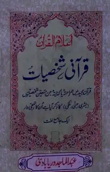 Aalamul Quran (Urdu: اعلام القرآن) is a book written by Indian scholar Abdul Majid Daryabadi on Science of Geography in the Quran. Published in 1959 by Sidq-i-Jadid Book Agency, Lucknow, comprising 208 pages, the book is an alphabetically arranged comprehensive dictionary of Quranic Personalities, whether human, angelic or diabolic mentioned in the Quran explicitly or implicitly.[1] Thus, it is a book on the human geography of the Quran: both individual and tribal geography is furnished. The book introduces to 158 personalities. It is a unique work on this genre. Along with Tafseer-e-Majidi written both in Urdu & English, Daryabadi has authored another book entitled Jugrafiyah Qurani which elaborates physical geography employed in the Quran.[2]