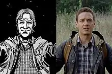 Aaron, as he appears in the comic book series (left) and as portrayed by Ross Marquand in the television series (right).