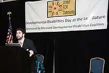 Aaron M. Kaufman (born February 15, 1987)[1] is an American politician and disability rights advocate.[2] A member of the Democratic Party, he is a member of the Maryland House of Delegates for District 18 in Montgomery County. Kaufman has cerebral palsy, and is the first member of the Maryland General Assembly with a physical disability.[3]