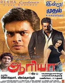 Aarya is a 2007 Indian Tamil-language romantic comedy film written and directed by Balasekaran and produced by Manoj Kumar and Vijay Anandan. The film stars R. Madhavan and Bhavana, while Prakash Raj and Vadivelu appear in supporting roles. The film's music was composed by Mani Sharma with cinematography by K. V. Guhan and editing by V. Jaisankar. The venture had a theatrical release across Tamil Nadu on 10 August 2007.