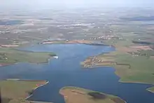 The reservoir has a current maximum area of 535 ha (1,320 acres), and has three sections separated by the Layer Breton and Layer de la Haye causeways. The easternmost large, deep Main section, originally 410 hectares (1,000 acres) was enlarged to its current 535 ha (1,320 acres) in 2013, the Central section covers 49 ha (120 acres), and the Western section is 16 ha (40 acres).[5] The current maximum water depth is about 17 m (56 ft), 3.2 m (10 ft) more than before the enlargement.[2]