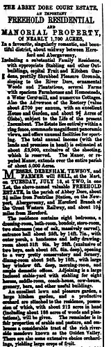 The Red Lion Inn which still forms part of Abbey Dore Court dates back to the early 1800s. In 1821 it was inherited by John Higford (1771-1852) as part of an estate in Abbey Dore consisting of 1434 acres. He had been born John Parsons but had changed his name to Higford at the time of his inheritance.[2] In 1852 he died and in his will the property was left to his cousin Captain Thomas Freke Lewis.[3]