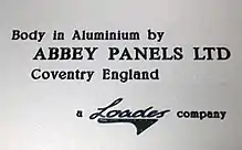 Abbey Panels Ltd., originally The Abbey Panel & Sheet Metal Co. Ltd., was a Warwickshire-based coachbuilding company founded on Abbey Road, Nuneaton in 1941, initially assembling Supermarine Spitfires for the ongoing war effort. The original partners were Edward Loades, Les Bean, Bill Woodhall and Ernie Wilkinson.[2] As the business grew they expanded to Old Church Road, Coventry before having their main manufacturing plant on the well known Bayton Road Industrial Estate in Exhall. In 1967,[2] Ted Loades listed the business on the London Stock Exchange (LSE) and it became known as Loades PLC, with Abbey Panels its main brand, alongside Albany Zinc (castings), Loades Dynamics (machining) and Loades Design (automotive styling) (previously known as Descartes Design). The company specialised in producing handmade prototype car bodies and did so for many notable car companies including: Bristol Cars, Lea Francis,[3] Jaguar Cars, Rover,[4][5] MG,[6] Healey,[7] Rolls-Royce,[8] Buick,[9] Lincoln, Volvo and BMW amongst others. They fashioned the bodywork of cars such as the Le Mans winning Ford GT40,[10][11][12][13][14][15] numerous Jaguars (XK120,[16] C-type,[17] D-type,[18][19] E-type,[20] XJ13,[21][22] XJ220,[23][24][25] XK180[26]), the original Mark I Land Rover Station Wagon,[27] Jim Clark's Lotus 38[28] and Stirling Moss's 1957 Pescara Grand Prix winning Vanwall.[29] They also produced many specialist parts for the aerospace industry, particularly for Rolls-Royce plc, such as the Rolls-Royce Pegasus engine duct of the Harrier jump jet.[30][31]