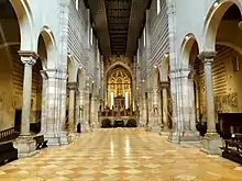 The present church, built on the site where at least five other religious buildings had previously stood, maintains its medieval origin substantially unaltered, representing an example of Veronese Romanesque architecture. The interior has a basilica plan with the hall divided into three naves by two rows of mighty pillars with a cruciform section alternating with columns. The ceiling is wooden in the shape of a ship's hull with refined decorations and was made between 1385 and 1389.[59] Originally the interior walls were to be entirely covered with frescoes, of which only portions remain today. Critics mostly tend to attribute them to a first and a second "master of San Zeno", actually two groups of fresco painters working in the city in the second quarter and second half of the 14th century, respectively.[60] The painters Martino da Verona and Altichiero da Zevio, or at least pupils of their school, have been proposed as the authors of additional frescoes.[61][62] On the right aisle is an altarpiece by Francesco Torbido.[63]