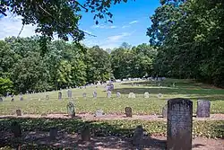 There are approximately 450 gravestones, with the earliest headstone dating to 1795. Around one dozen unmarked field stones may date even earlier. The 351 locally manufactured gravestones makes it the largest such group in Davidson County, North Carolina. All of the epitaphs are inscribed in English because of the English and Scotch-Irish settlers who were members of the church. This was in spite of the headstones being cut by local German stonecutters.[2]