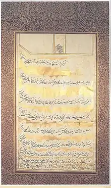 Abdallah Khan was part of the first generation of Qajar-era painters, which also included Mirza Baba, Mihr 'Ali, and Mohammad Hasan Khan.[3] In Tehran in 1812, Abdallah Khan met with English orientalist William Price, a member of the Gore Ouseley mission to Iran. During the meeting, Abdallah Khan introduced Price to his work.[4] Khan died in c. 1850, during the early years of Naser al-Din Shah Qajar's reign as shah (1848-1896).[5] Not much is known about Abdallah Khan's personal life.[5]