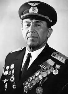After the start of Operation Barbarossa he requested to be sent to the front, but was initially denied and retained as a flight instructor instead. From 1941 to 1942 he trained 71 pilots, after which he mastered piloting a new variant of the Li-2. In February 1944 he was sent to the front per his request, and assigned to the 10th Guards Aviation Division. That year flew 109 night missions delivering cargo to troops and partisans as well as reconnaissance. As pilot-in-command, his crew consisted of co-pilot Pyotr Gordienko, navigator Nikolai Smirnov, flight engineer Nikolai Dyomin, and radio operator Mikhail Malinkin. On 1 January 1945 he was reassigned to the 19th Special-Purpose Civil Aviation Regiment, in which he flew missions in Poland to provide assistance to partisans under Siarhei Prytytski. In addition to the Soviet Order of the Patriotic War and Order of the Red Banner he was awarded the Polish Virtuti Militari for his sorties. On 9 May 1945 he flew in the mission that delivered the German Instrument of Surrender and Victory Banner to Moscow.[2][4][5][6]