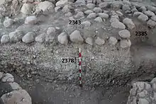 In May 2012, a four-day survey was conducted, combining an extensive walking survey with limited shallow (up to 10 cm) excavation in six areas spread around the site.[10] The survey showed that there was occupation in the Early Bronze [EB] II-III, Middle Bronze [MB] II, Late Bronze [LB]I-II, Iron Age I-II, Persian, Hellenistic, Byzantine, Early Islamic, Crusader, Mamluk and Ottoman periods. The survey also revealed that the lower part of the tell in the south has an outcropping of bedrock running through much of its center, indicating that the ancient remains in this part of the site should be sought around its perimeter.