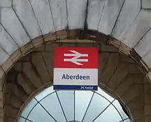 Signage at Aberdeen station in May 2012, showing National Rail double-arrow logo