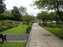 Other grants made by the trust were less controversial: for those who lost their house, or whose property suffered significant damage, the trust donated £100 to assist with evacuation, and additional funds to help replace damaged effects.[134][lower-alpha 12] £100,000 was set aside for the future needs of the eight children physically injured in the disaster, and £5,000 was placed in trust for them for when they came of age.[133][lower-alpha 13] The charity funded the building of a community centre in the village and a memorial garden, which was opened by the Queen in March 1973.[135][136] The garden is on the site of Pantglas Junior School and includes stone walls to show where the classrooms stood.[137]