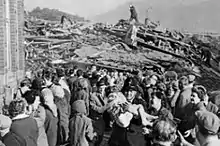 After the landslide stopped, local residents rushed to the school and began digging through the rubble, moving material by hand or with garden tools.[43] At 9:25 am Merthyr Tydfil police received a phone call from a local resident who said "I have been asked to inform that there has been a landslide at Pantglas. The tip has come down on the school";[44] the fire brigade, based in Merthyr Tydfil, received a call at about the same time.[45] Calls were then made to local hospitals, the ambulance service and the local Civil Defence Corps.[46] The first miners from the Aberfan colliery arrived within 20 minutes of the disaster, having been raised from the coal seams where they had been working. They directed the early digging, knowing that unplanned excavation could lead to collapse of the spoil and the remnants of the buildings; they worked in organised groups under the control of their pit managers.[46][47]
