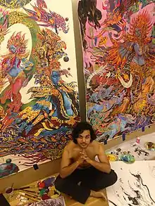 Artist Abhishek Singh in front of his Goddess Paintings. (Left) Triveni-the three aspects of the river (Right) Bhagvati-Shakti creating the Gods.