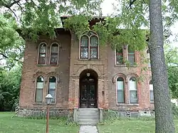 The Abner C. Johnson House is a The two-story wood-framed Italianate house clad in brown brick. The original section is rectangular, measuring thirty-six feet by twenty-eight feet. It sits on a high basement made of multicolored dressed fieldstone. It has a hipped roof with wide eaves and paired corner brackets; a fourteen by eight foot clapboard-covered belvedere tops the building.[2]