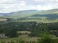 The village of Aboyne was founded by Charles Gordon, 1st Earl of Aboyne in 1671, who, in the same year, rebuilt the west wing of Aboyne Castle.[7] The siting of the castle itself is related to the limited number of the crossings of the Mounth of the Grampian Mountains to the south.[8] In 1715 Aboyne was the scene of a tinchal, or great hunt, organised by John Erskine, sixth Earl of Mar, on 3 September, as a cover for the gathering of Jacobite nobles and lairds to discuss a planned Jacobite rising. The uprising began three days later in Braemar.[9]