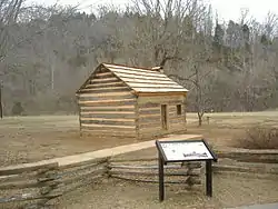 The two historical buildings at the location are the Lincoln Tavern and the Gollaher Cabin.[10] The Tavern was built in 1933 at the cost of $4,200; the 1.5 floor structure was constructed of logs and concrete in an asymmetrical plan. The Gollaher Cabin was likely built around the year 1800, and moved to its present location to reflect what the Lincoln cabin would look like. It is thought to be the cabin Austin Gollaher's family lived in during Lincoln's stay at Knob Creek Farm.[11] The tavern was built to cash in on the booming tourist trade that came to LaRue County to see sites connected with Lincoln, much as the Nancy Lincoln Inn was. It was originally a dance hall that served liquor, but when LaRue County became "dry" in 1942, it was converted to a museum and gift shop, as it remained until it was closed in 1998. During the 1980s, when it was privately owned 20,000 annually visited the complex.[12]