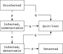In the standard CDC model, the Markov chain has five states, a state in which the individual is uninfected, then a state with infected but undetectable virus, a state with detectable virus, and absorbing states of having quit/been lost from the clinic, or of having been detected (the goal). The typical rates of transition between the Markov states are the probability p per unit time of being infected with the virus, w for the rate of window period removal (time until virus is detectable), q for quit/loss rate from the system, and d for detection, assuming a typical rate at which the health system administers tests of the blood product or patients in question.