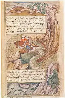 Folio from the Darab-nama depicting Kay Bahman and his horse being devoured by a dragon. Copy made in Mughal India, dated c.1585