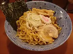 Aburasoba (油そば), also known as maze soba (Japanese: まぜそば, lit. 'mixed noodles'), monjasoba (もんじゃそば), tenukisoba (手抜きそば), abu ramen (あぶラーメン) or shirunashi ramen (汁なしラーメン), is a dry noodle dish made with a sauce of soy sauce and pork lard.[1] Traditional ingredients include shoyu tare base, aroma oil, menma, shredded nori, and green onions. Other variations also include toppings like raw garlic, raw egg, cheese, and minced meat, which are mixed with the noodles before eating.[2]
